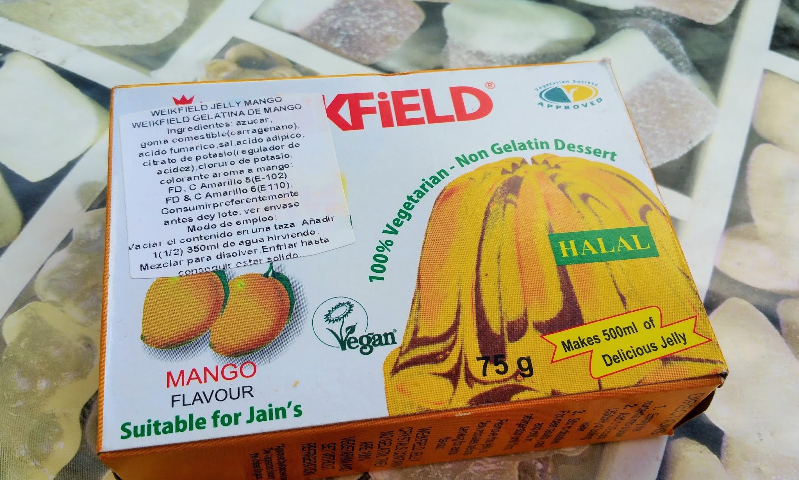 Preparado para hacer gelatina apto para veganos de marca Weikfield, hay de diferentes sabores: mango, fresa, frambuesa, plátano, naranja, cereza, menta, lima y manzana. Queda muy suave y el sabor es rico. Encontrado en un supermercado de comida hindú. La hemos usado en la preparación de esta Tarta vegana de crema pastelera y fruta.